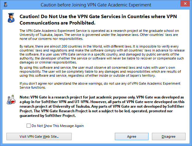 VPN Gate functions are very strong, and you might be under the risks. So the following warning message will appear. Read the message and click the "Agree" button only if you agree the notices.